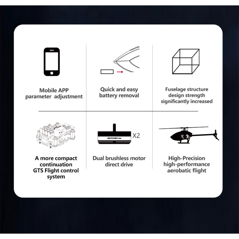 Presentamos la nueva versión del legendario Goosky S1, construida sobre la plataforma de confianza que ya conoces, pero perfeccionada para ofrecerte una experiencia de vuelo aún más inmersiva y sencilla. Con un diseño renovado y mejoras clave en conectividad, este helicóptero reafirma su posición como el estándar de oro para pilotos que buscan alto rendimiento desde el primer momento.
