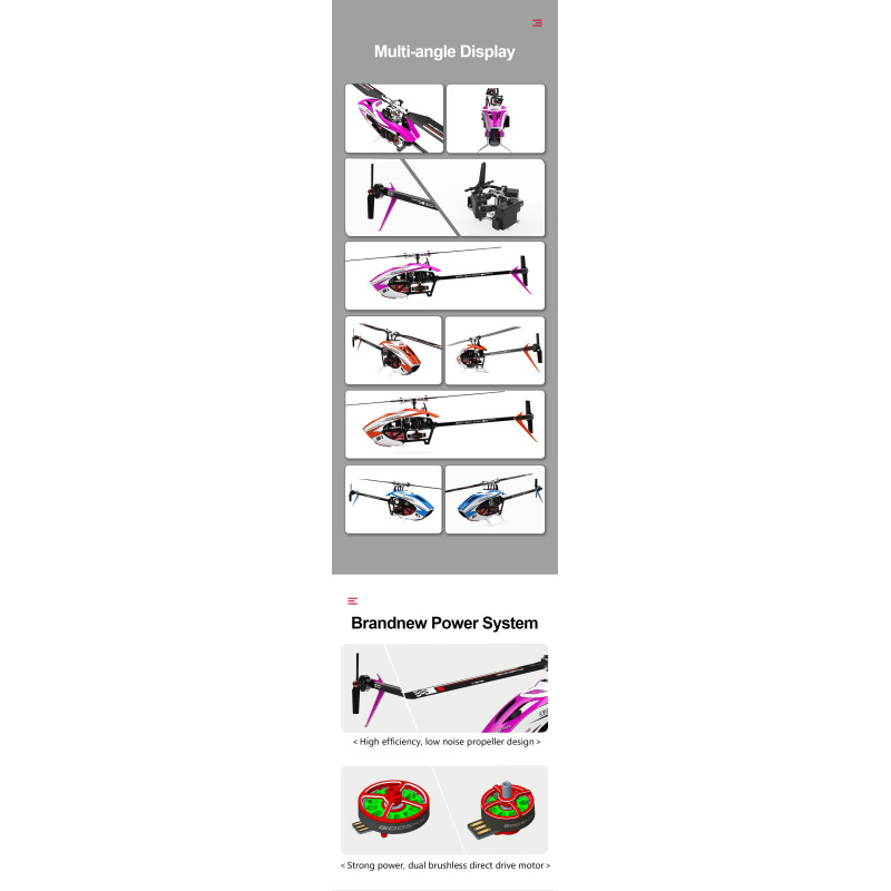 El corazón del S1 late con dos motores brushless de transmisión directa, que ofrecen una respuesta de potencia excepcional y un funcionamiento sorprendentemente silencioso gracias a sus hélices de alta eficiencia. Combinado con su cabeza de rotor flybarless de paso colectivo y plato cíclico de aluminio, obtienes un control estable y milimétrico, ideal para desde vuelo tranquilo hasta acrobacias 3D más avanzadas.