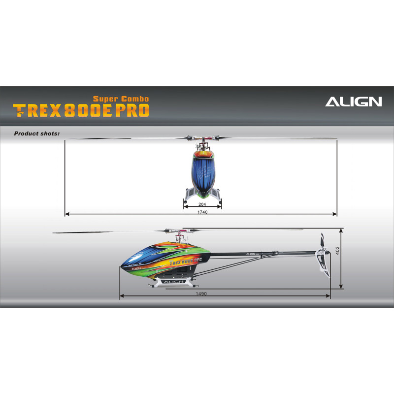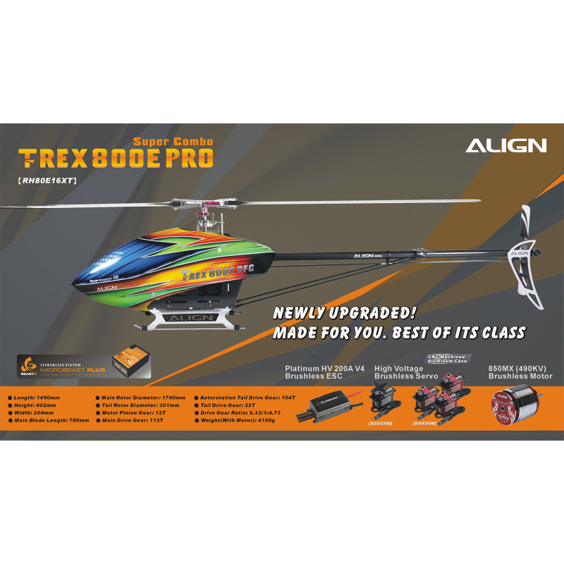 El T-REX 800E PRO puede describirse como el actual modelo insignia de primera línea que representa la superior línea de productos de Align. Basado en el linaje del puro vuelo 3D, el concepto de diseño más reciente con un equipamiento absolutamente de primera línea, junto con una estética superior y líneas atractivas, ¡el T-REX 800E PRO definitivamente elevará la adrenalina en tu sangre!